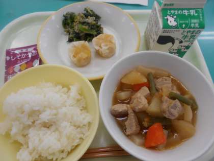 本日の献立は、人参シューマイ、よごし、大根と豚肉の煮込み、ふりかけ、です。