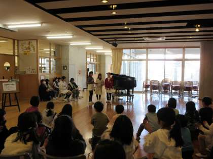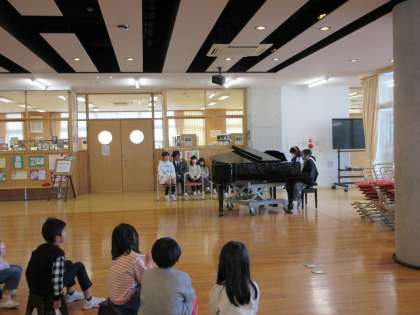 第4回中庭テラスコンサートが行われました。クリスマスコンサートとして2学期末に予定していたものが延期になっており、ようやく開催することができました。ピアノの演奏やダンスなどのすてきな発表があり、見に来た子供たちから温かい拍手が送られました。
