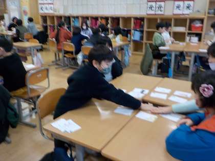 漢字の音読みと訓読みを使って文作りをし、手作りの読み札と取り札でかるたをしました。グループで協力して、16枚ずつの札を作りました。取り札の絵を描くのが大変そうでしたが、みんな楽しんで盛り上がりました。