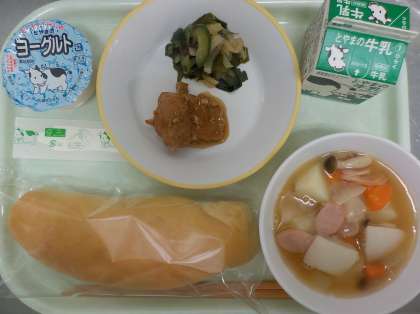 本日の献立は、米粉コッペパン、牛乳、照り焼きチキン、海藻サラダ、豆ときのこのスープ煮、ヨーグルト です。