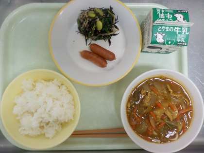 本日の献立は、ごはん、牛乳、あらびきウインナー、鉄たっぷりサラダ、スタミナカレーうどん です。
