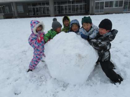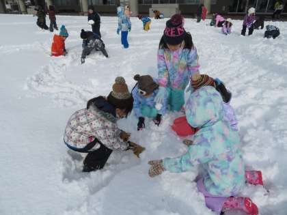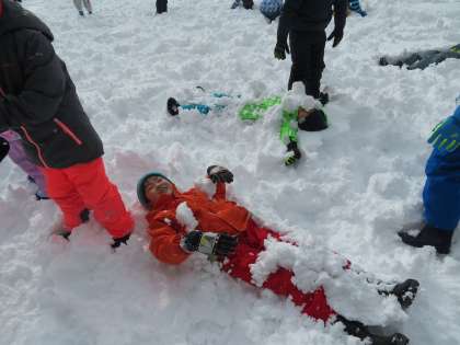 昨日から降り積もった雪でグラウンドは一面真っ白になりました。そこで、今日は学年で雪遊びをしました。子供たちは、大きな雪玉をつくったり、雪の上に寝転がったりして、雪を思い切り楽しみました。