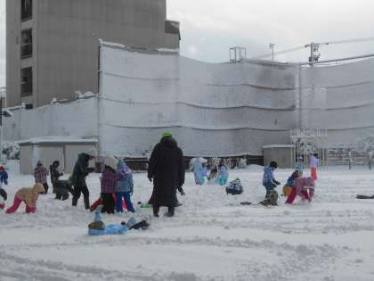 写真は中より、1年生の雪遊びとセントラルタイム後のグラウンドの様子です。やっぱり「子供は風の子」ですね。