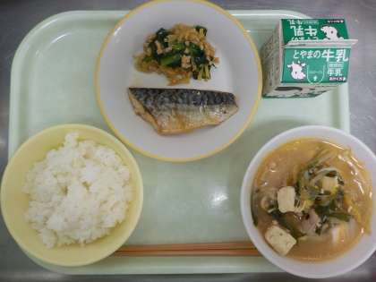 本日の献立は、ごはん、牛乳、さばの塩焼き、ねばーる納豆和え、全集中ごまキムチ鍋 です。