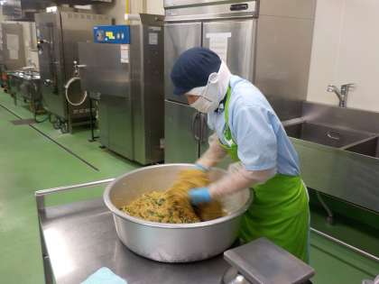 写真(下)は「ねばーる納豆和え」を作っている様子です。先に、小松菜、たくあん、しょうゆを混ぜ合わせ、最後に納豆と和えます。納豆を混ぜすぎないことがポイントです。
