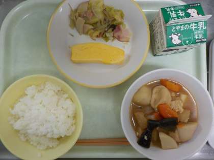 本日の献立は、ごはん、牛乳、厚焼き卵、ベーコンとエリンギのソテー、おでん です。