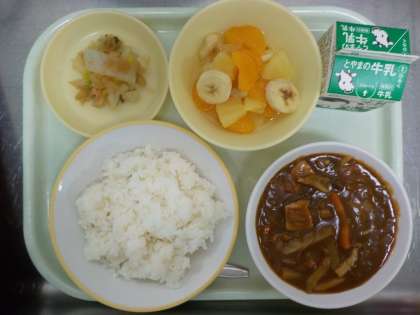 本日の献立は、ごはん、牛乳、たべキリンハヤシ、ふくじんあえ、フルーツミックス です。