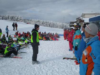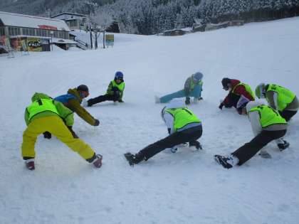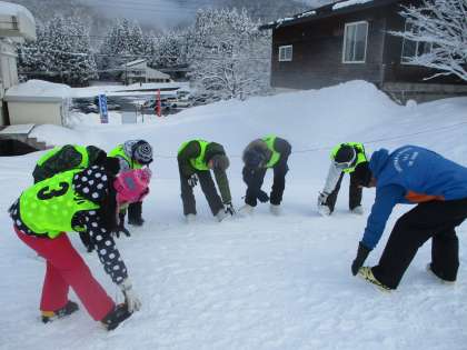 2月6日(火)、立山山麓スキー場らいちょうバレーエリアへスキー学習に行ってきました。開講式では、6年生の代表児童がスキー学習の意気込みを語り、インストラクターの先生方にあいさつをしました。その後、各班に分かれてストレッチをし、午前の練習が始まりました。