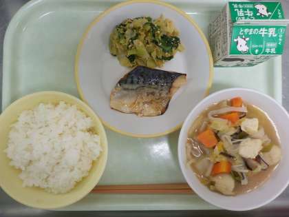 本日の献立は、ごはん、牛乳、さばの塩焼き、いり大豆和え、ちゃんこ鍋 です。