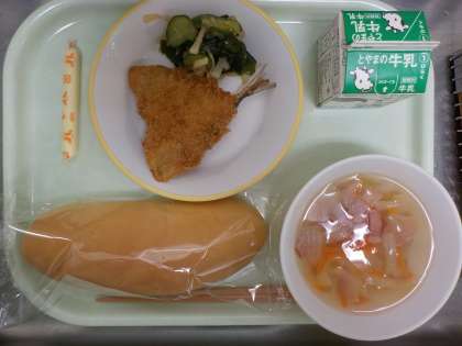 本日の献立は、コッペパン、牛乳、あじフライ、大根サラダ、マカロニスープ、棒チーズ です。
