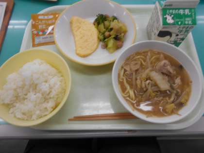 本日の献立は、オムレツ、ビーンズサラダ、とんこつラーメン、野菜ふりかけ、です。
