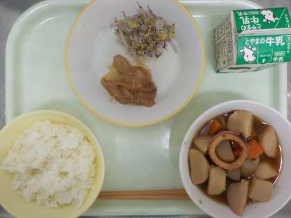 本日の献立は、ごはん、牛乳、照り焼きチキン、ゆかり和え、里芋といかの煮物 です。