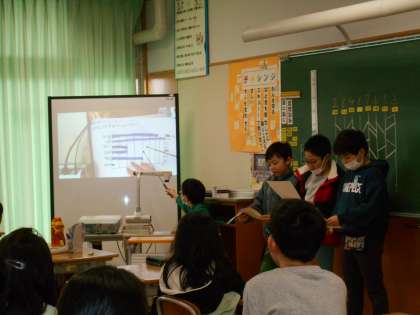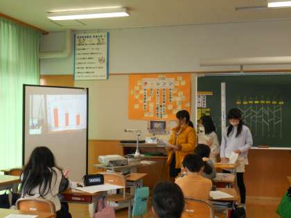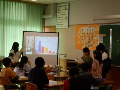 国語科では、生活についてクラスのみんなにアンケートを取って、分かったことを発表しました。画用紙に表をかいてまとめながら、それぞれのグループで工夫して発表しました。