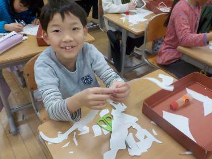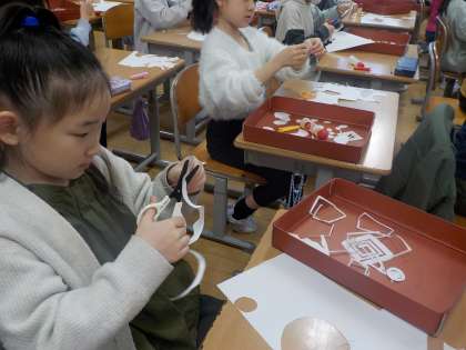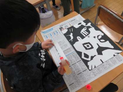 図画工作科「はさみであーと」をしました。1枚の真っ白な紙を自由自在に切り、その後、黒の画用紙に置いて、見えてくる形を想像して作品を仕上げました。