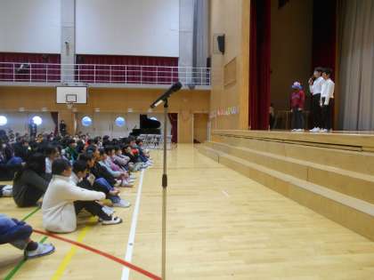昨日は、5年生が頑張りました。そして下級生も続きました。1年生と手をつないで6年生が入場。2年生が似顔絵ペンダントのプレゼント。3年生の出し物(長縄対決)、4年生の出し物(ダンス)、5年生の出し物(劇)、下級生の全員合唱に続いて、卒業生の出し物(人文字)が続きました。温かい卒業を祝う集会でした。