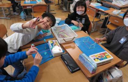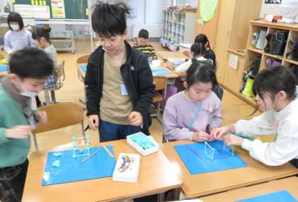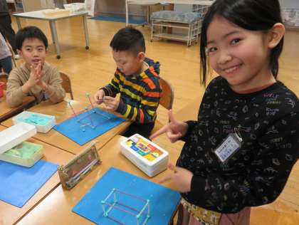 長さの異なる2種類のストローと粘土を使って直方体と立方体の模型を作りました。