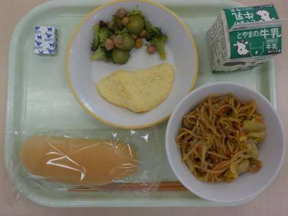 本日の献立は、コッペパン、牛乳、やきそば、オムレツ、ビーンズサラダ、ポケットチーズ です。