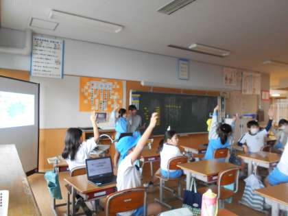 社会科では、1年の学習のまとめとして、各市町村の情報をスライドにまとめました。クイズを入れたり、アニメーションを効果的に使ったりするなど、各チームそれぞれ工夫を凝らしていました。