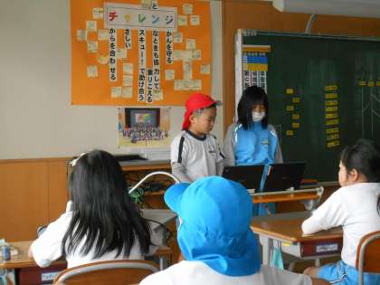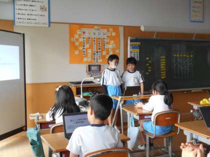 社会科では、1年の学習のまとめとして、各市町村の情報をスライドにまとめました。クイズを入れたり、アニメーションを効果的に使ったりするなど、各チームそれぞれ工夫を凝らしていました。
