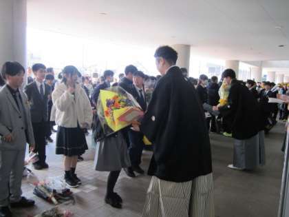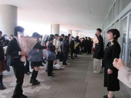 卒業式後に、各クラスで最後の学級活動が行われました。その後、交流モールで、歓送の会が開かれました。卒業生代表の言葉では、6年生の代表児童が小学校生活においての感謝の気持ち、中学校生活への意気込みを述べました。担任の先生への花束贈呈の後、万歳三唱を行い、5年生や保護者の方々に見送られながら、晴れやかに巣立っていきました。