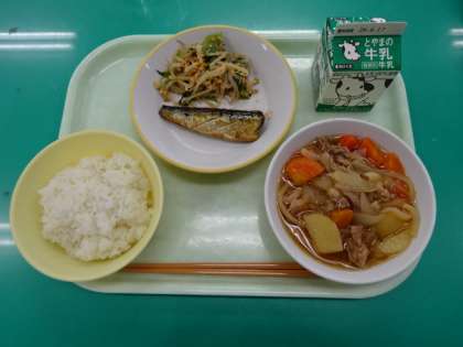 今日の給食は、ご飯、牛乳、いわしの梅煮、いり大豆和え、肉じゃが です。1年生も上手に配膳しています。