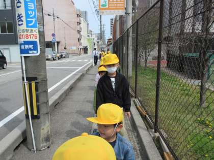 その後、学校の周辺を歩きました。道路を渡るときの「止まる」「見る」「待つ」の約束を守って安全に歩くことができました。