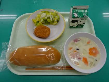 今日の献立は、コッペパン、牛乳、豆とかぼちゃのコロッケ、ピクルス、クリームチャウダー です。ラッキーな人には、桜の花びら型のにんじんが入っています。