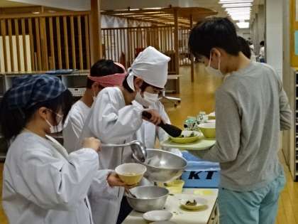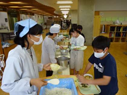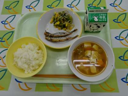 今日は、ご飯、牛乳、ししゃもの唐揚げ、コーン和え、白玉汁 です。今日は、白玉汁の中に魚型のにんじんが入っていました。給食の時間が楽しみになる工夫がされています。写真は6年生の様子です。てきぱきと、あっという間に配膳を終える姿は、さすが最高学年です。
