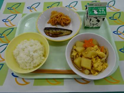 今日は、ご飯、牛乳、いわしのしょうが味、切り干し大根のケチャップ炒め、卵とじです。卵とじには、星型のにんじんが入ってました。