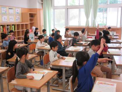 上の写真は、国語科の「はなのみち」の学習に取り組んでいる様子です。積極的に手を挙げ、考えたことを発表しています。