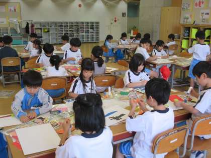 下の写真は、図画工作科の「やぶいたかたちからうまれたよ」の学習に取り組んでいる様子です。グループの友達と相談したり、思い浮かんだことを紹介したりしながら作品を作っています。