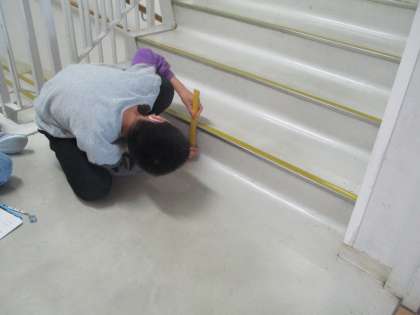算数科「比例」の学習では、階段を使って中央小学校の1階の床から3階の床までの高さを調べました。「1階の床からの高さ」は「上がる階段の数」に比例していることを使って、子供たちは階段の1段の高さを測り、階段の段数を数え、計算で答えを求めていました。