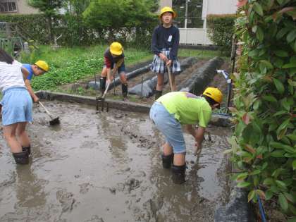 子供たちは「セントラル水田」を稲作を行うことができるような水田にするために、日々整備しています。今回は「セントラル水田」の代かきを行いました。代かきは、田んぼに水を入れ、土をかき混ぜ泥状にする作業です。子供たちは田んぼの中に入り、田んぼの中を歩きながら水と土をかき混ぜ泥状にしました。仕上げに道具を使って、土を軟らかくして苗を植え付けやすくしました。