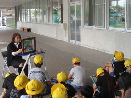 JAなのはなの方をお招きして、自分たちで米を育てるための田植えを行いました。子供たちは、JAなのはなの方が用意してくださった米作りについての紙芝居を真剣に聴いたり、積極的に質問したりしていました。