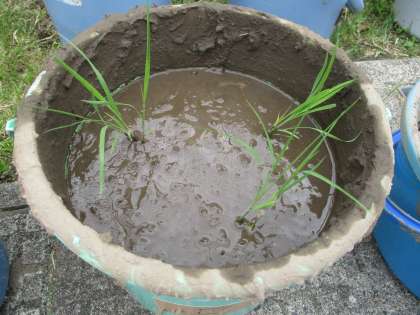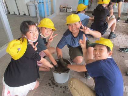 子供たちは「バケツ稲」にも挑戦しました。手を泥だらけにしながら、笑顔で「富富富」の苗を植えていました。これからも調べ学習を続けていき、成長していく様子を観察しながら、お世話をしていきます。