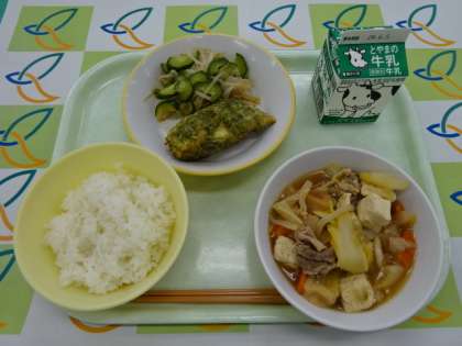 今日は、ご飯、牛乳、魚の磯辺揚げ、甘酢和え、すき焼きでした。