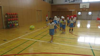 2年生の体育では、ボール投げを行っています。コーンや段ボールを的にして、様々な置き方を楽しみながら、ボール投げに積極的に取り組んでいます。