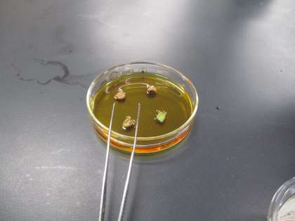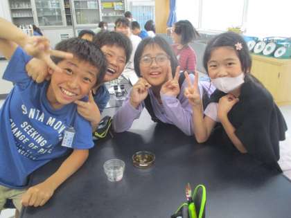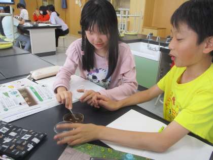 子供たちが理科の授業で育てているインゲンマメが順調に成長しています。子供たちは自分が育てているインゲンマメに毎日欠かさず水をあげ、成長している様子を観察しています。今回はヨウ素液を使って、種子や子葉の養分について調べる実験をしました。