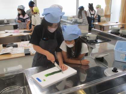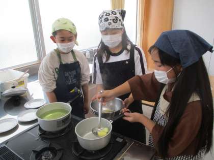 家庭科「ゆでる調理でおいしさ発見」の学習では、「ほうれん草のおひたし」や「ゆでいも」をつくる調理実習を通して、青菜とじゃがいものゆで方を比べたり、ゆでることによって味や色、かさなどがどのように変化するのかについて調べました。また、おいしくゆでるためには、食品や調理の目的に合ったゆで方を考えて調理することが大切であると学ぶことができました。