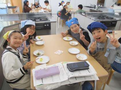 子供たちは、完成した料理をおいしく食べながら、満足そうな表情を浮かべていました。写真は、1組の調理実習の様子です。