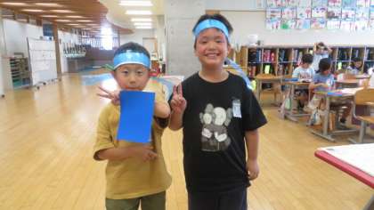 図画工作科「わっかでへんしん」では、輪っかを使って頭や腕の飾りを作る学習をします。自分だけの素敵な飾りになるよう工夫しています。