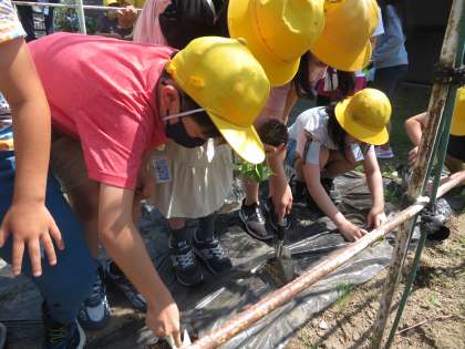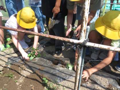 種から育てたヘチマが目を出し、本葉も増えたので、畑に植えかえました。根を傷めないように、土ごと丁寧に植えました。これからどれだけ伸びるのでしょうか。楽しみですね。