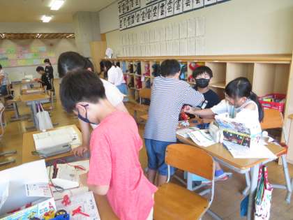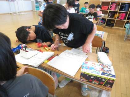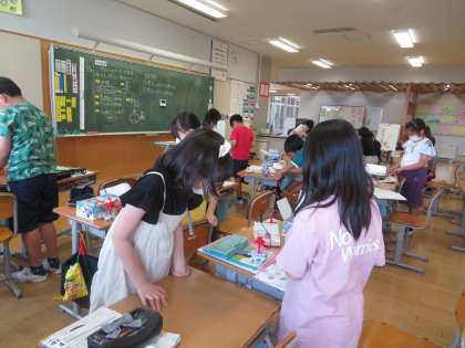 理科では、電流の流れる向きを調べています。検流計を使って、電池の向きを変えながら、図に結果を書き込みました。風の向きの変化にも気付いていたようです。次は、二つの電池のつなぎ方をみんなで考えていきましょう。