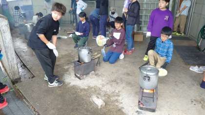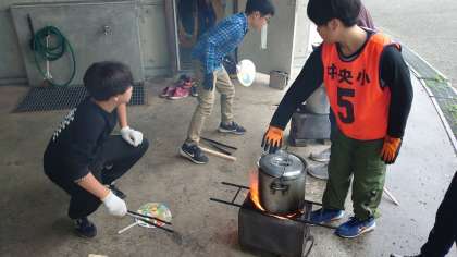 雨のため、屋根のある場所に変更して野外炊飯を行っています。 煙と奮闘しながら調理中。