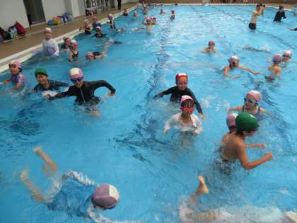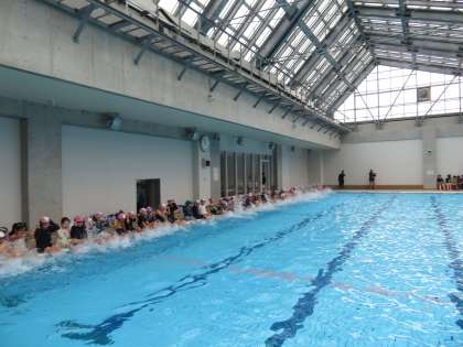 全校で、プールの使い方を確認した後、模範水泳が行われ、4年生と合同でプールに入りました。