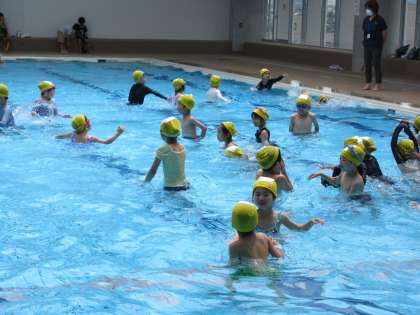 今日は、バディを組んで一緒にプールの中を回ったり、おいかけっこをしたりして水の中で体を動かしました。バディで声をかけ合って取り組む姿が素敵でした。少しずつプールの深さにも慣れ、笑顔が見られました。