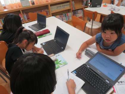 国語科「仕事のくふう、見つけたよ」では、自分が興味をもった仕事の工夫について調べ、ほうこくする文章にまとめています。本やインターネットを使用して熱心に調べています。