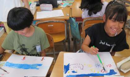 図工科の授業では、「あの日あの時の気持ち」の学習に取り組んでいます。夏休みの思い出に思いを込めて、絵を描いています。