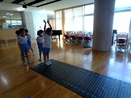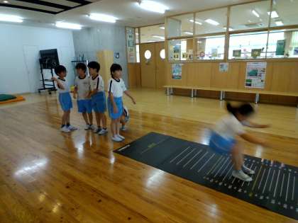 立ち幅跳びで脚力や跳躍力を鍛えています。
