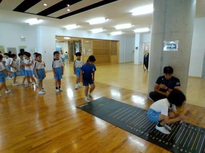立ち幅跳びで脚力や跳躍力を鍛えています。